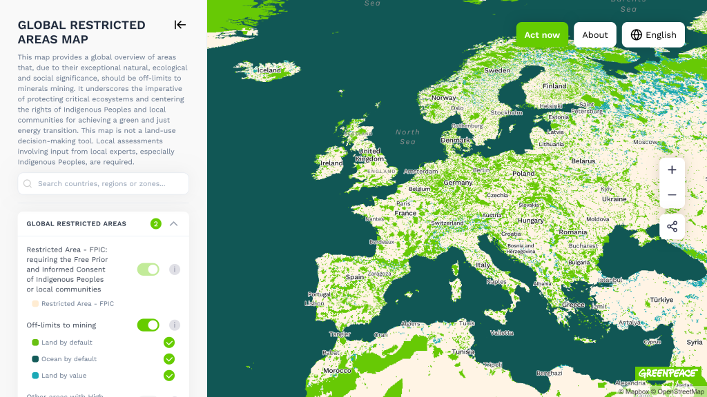 The global Restricted Areas Map for transition minerals mining has been defined by Greenpeace International to identify areas with high ecological, natural, and social values that should be off-limits to extractive activities such as transition minerals mining, in order to move the Earth’s trajectory to one that limits global average temperature rise to no more than 1.5°C while also respecting other crucial interconnected planetary boundaries as well as the rights of Indigenous Peoples and Local Communities. Combined with Reserve Proxy Areas, the mapping also provides an indicative analysis of transition mineral reserves outside of areas that must be protected to respect planetary boundaries and aims to raise the public debate on risks of mineral demand projections in the context of the energy transition.